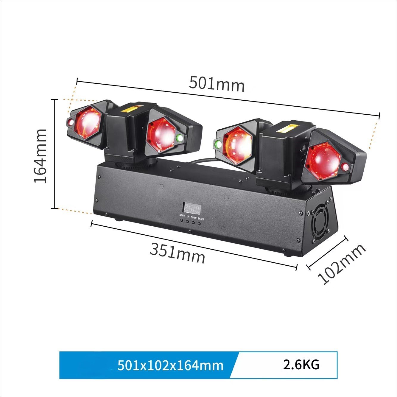 Equipada con 4 LEDs RGBW 4-en-1 de 8W, esta cabeza móvil produce colores intensos y efectos beam muy definidos. Además, incorpora láser rojo y verde que añade patrones luminosos espectaculares y 2 potentes estrobos LED de 10W para crear momentos de alto impacto en el espectáculo.