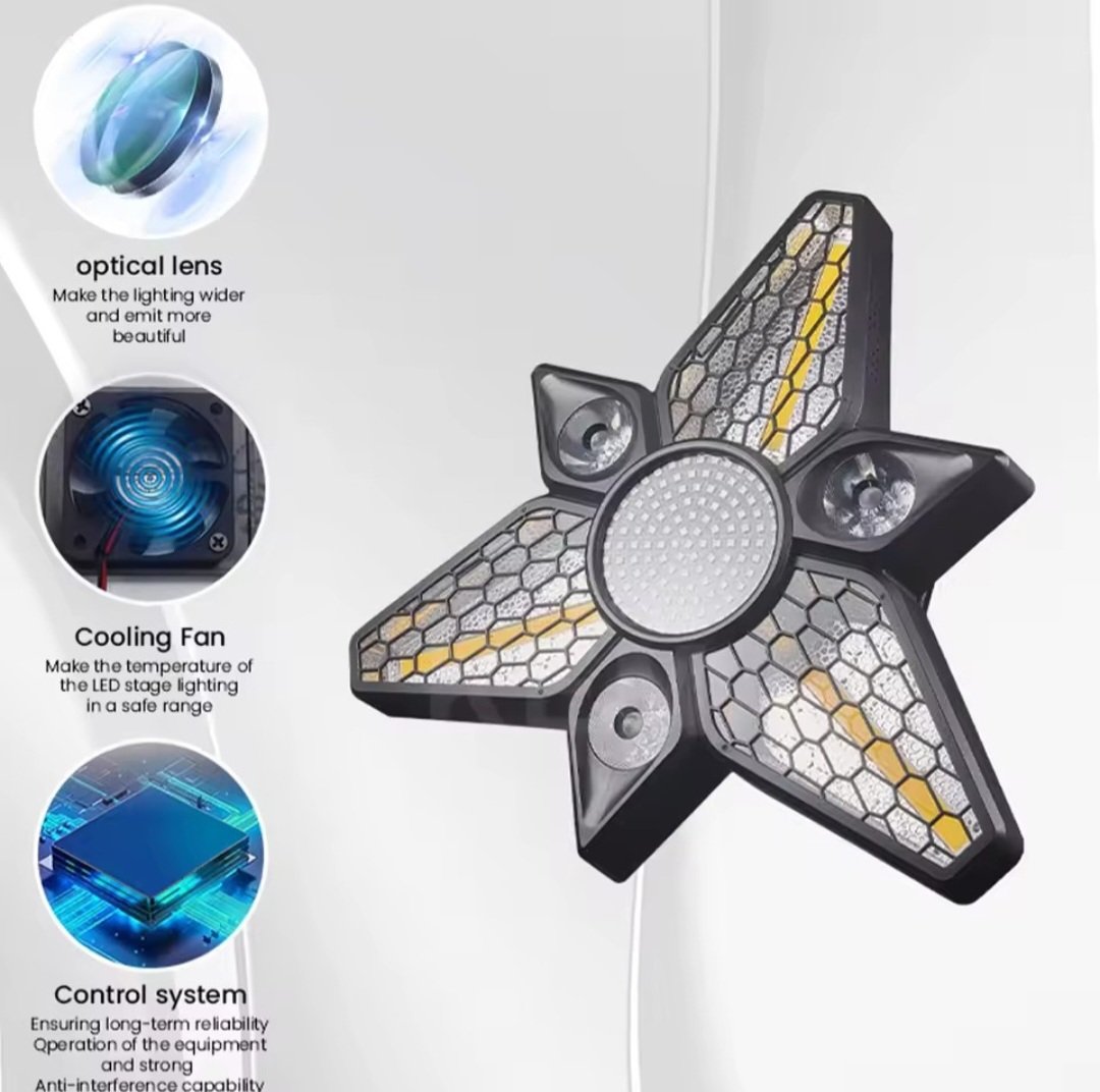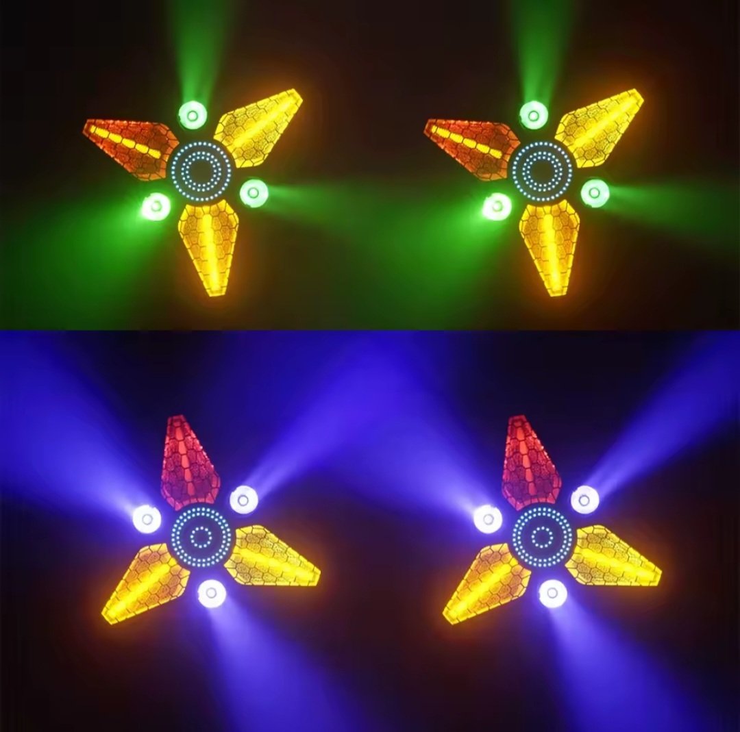 Este innovador foco combina múltiples fuentes de luz LED para crear efectos dinámicos y espectáculos de iluminación impactantes. Incorpora 36 LEDs RGB 3-en-1, 3 potentes luces doradas de 80W, 3 LEDs RGBW de 25W y 127 LEDs multicolor, ofreciendo una mezcla única de colores, patrones y ambientes.