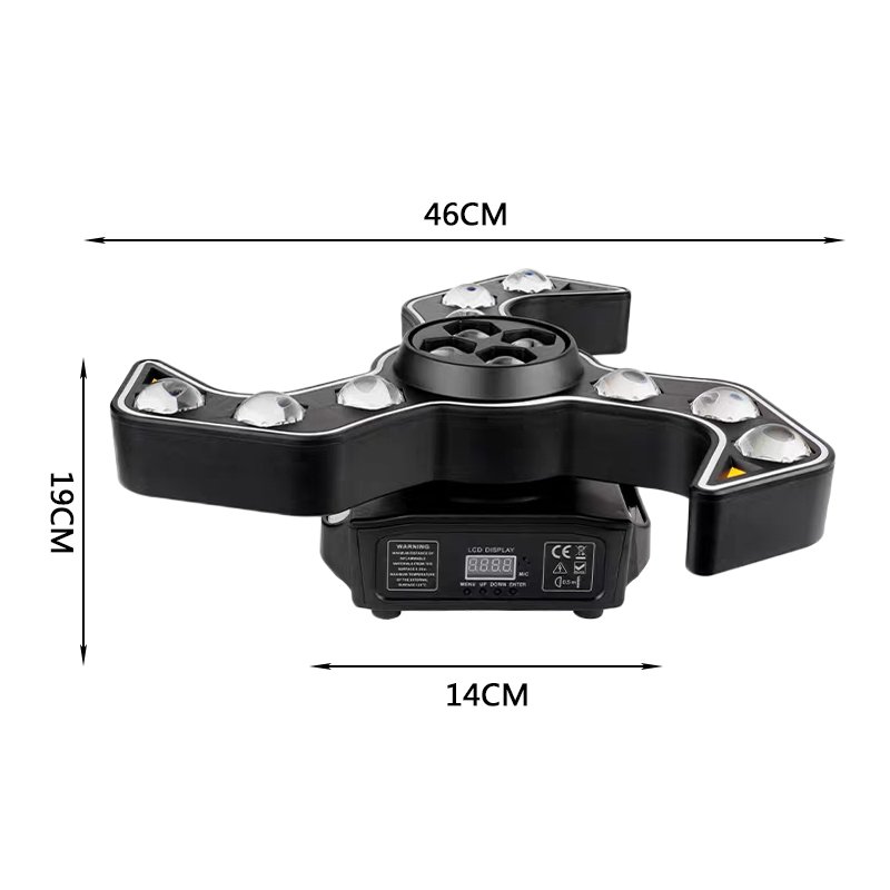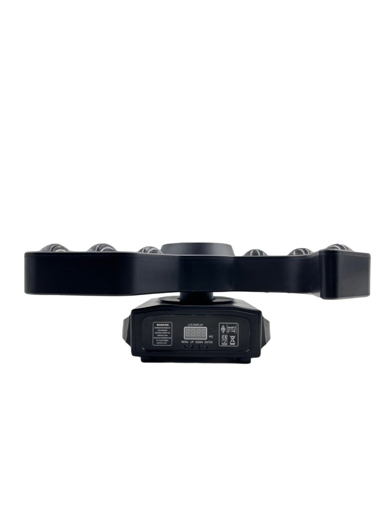 La Cabeza Móvil Triple Boomerang RGB 120W es una potente luz para DJ y discotecas que combina 9 LEDs Beam RGB 4-en-1, 4 efectos Bee Eye centrales y 3 estrobos de alto impacto.