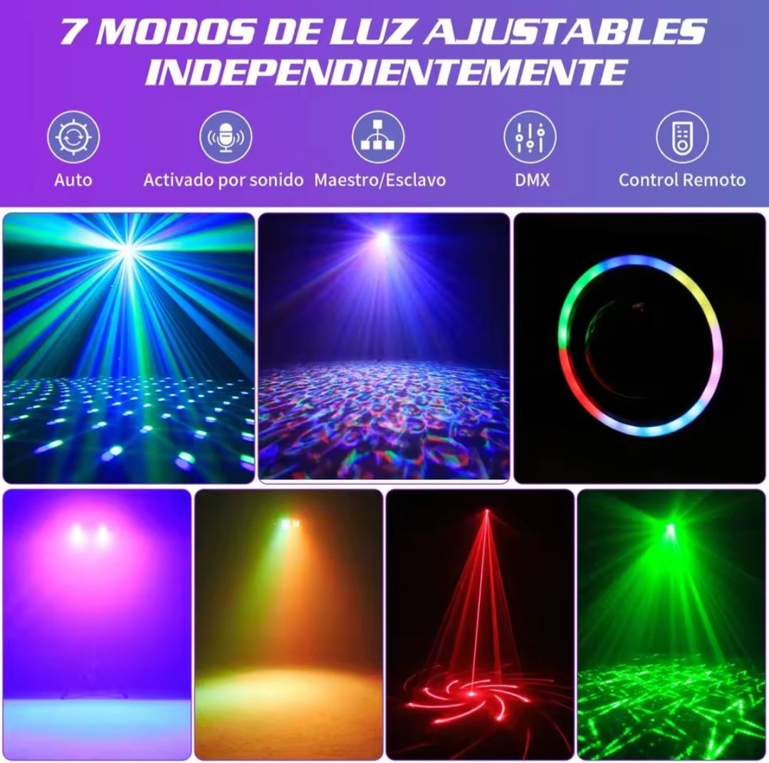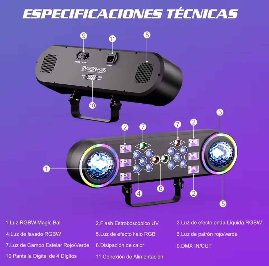 7 efectos integrados: bola mágica, agua, wash, estrobo UV y láser rojo/verde
