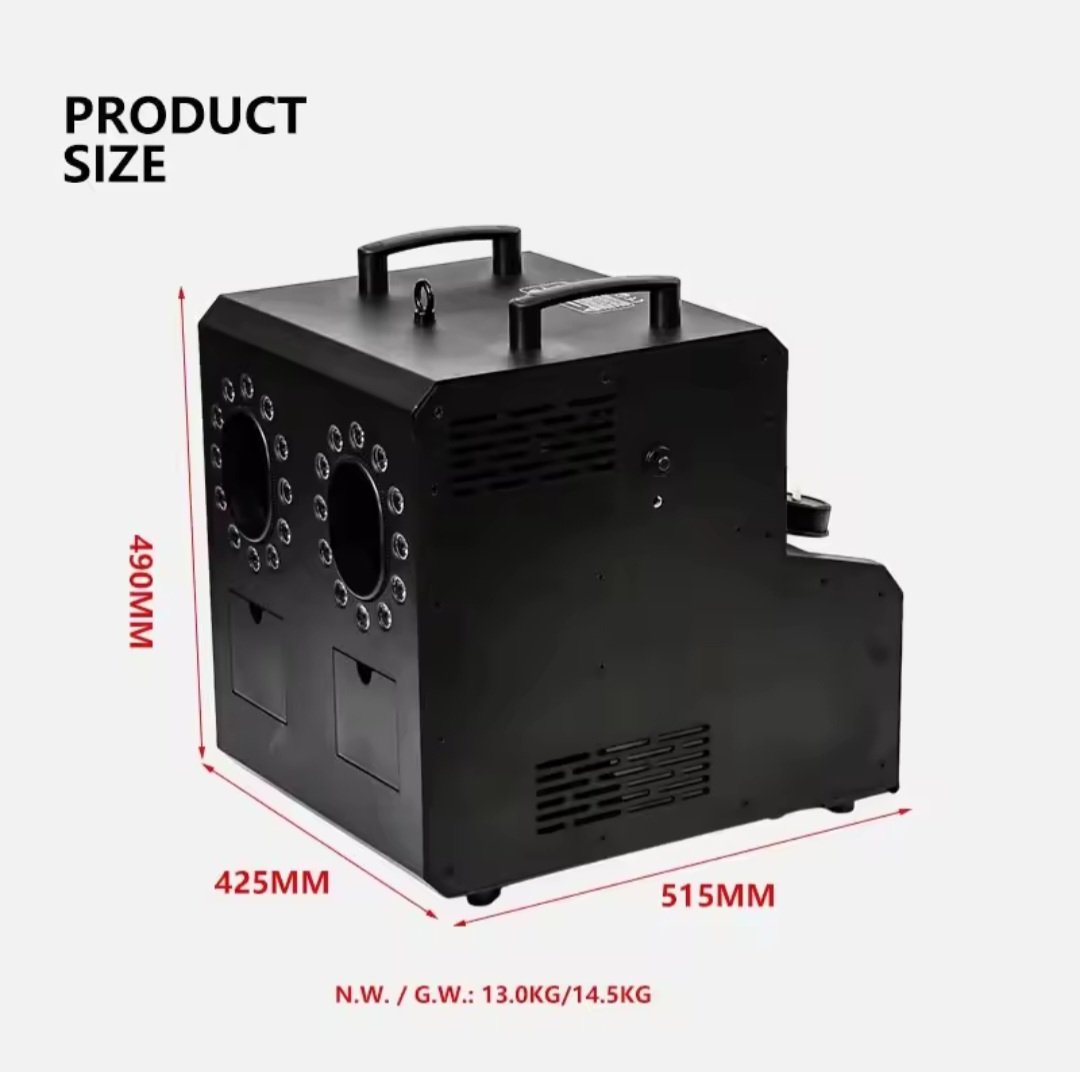 Esta máquina ofrece un rendimiento superior, con una distancia de humo de hasta 8 metros y una altura de burbujas de 6 metros, ideal para eventos medianos o grandes.