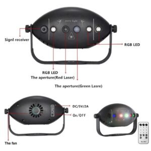 📦 Incluye: 1 Mini Láser RGB, 1 mando a distancia y cable USB.